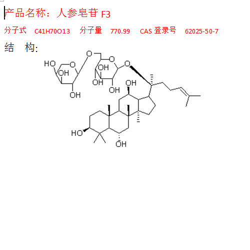 中文名稱 人參皂苷F3 中文別名 補(bǔ)充中 英文名 Ginsenoside F3 英文別名 Dammarane, β-D-glucopyranoside deriv. 分子式 C41H70O13 分子量 770.99 CAS登錄號(hào) 62025-50-7 提取來源 五加科植物人參(Panax ginseng)的干燥根。 化學(xué)結(jié)構(gòu) 外觀 補(bǔ)充中 鑒別方法 NMR; MS 貯存條件 補(bǔ)充中有效期 2年 注意事項(xiàng) 無 溶解性 補(bǔ)充中 測定方法 補(bǔ)充中 藥典測定方法 補(bǔ)充中 用途 用于含量測定/鑒定/藥理實(shí)驗(yàn)等
