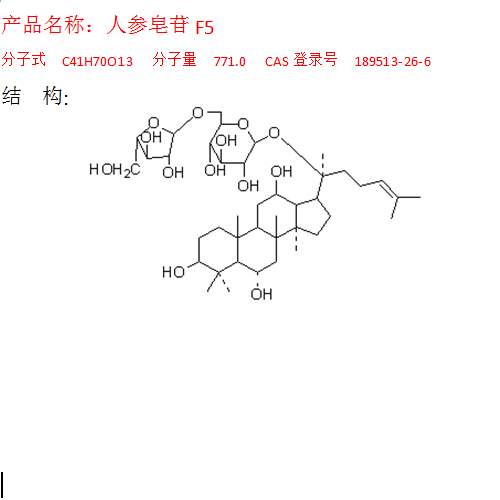 中文名稱 人參皂苷F5 中文別名 補(bǔ)充中 英文名 Ginsenoside F5 英文別名 補(bǔ)充中 分子式 C41H70O13 分子量 771.0 CAS登錄號 189513-26-6 提取來源 人參 化學(xué)結(jié)構(gòu) 外觀 白色粉末 鑒別方法 NMR,MS貯存條件 4℃冷藏、密封、避光有效期 2年 注意事項(xiàng) 無 溶解性 溶于吡啶,DMSO,甲醇 測定方法 補(bǔ)充中 藥典測定方法 補(bǔ)充中 用途 用于含量測定/鑒定/藥理實(shí)驗(yàn)等