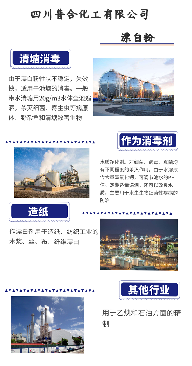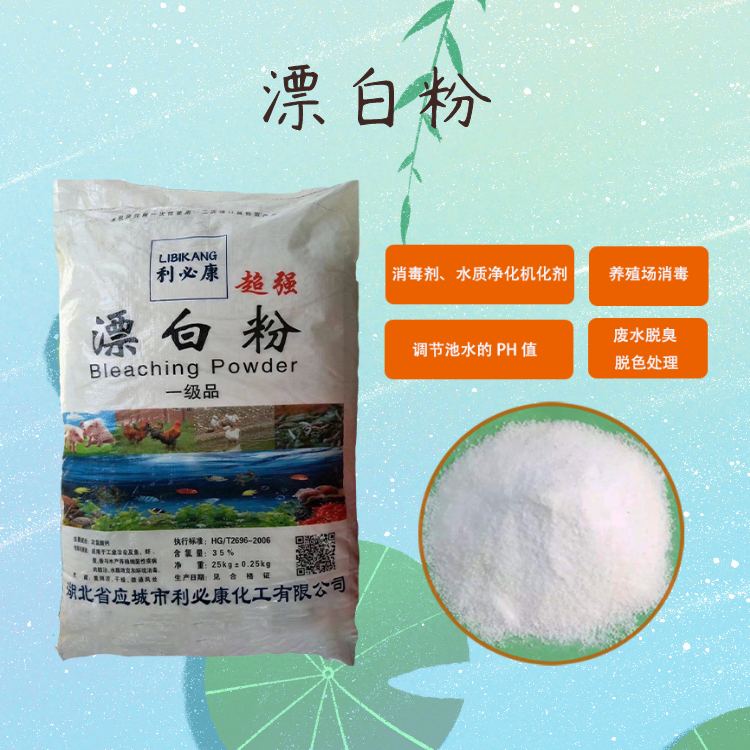 我國食品行業(yè)廣泛使用漂白粉作為殺菌消毒劑,價格低廉、殺菌力強、消毒效果好。如用于飲用水和果蔬的殺菌消毒,還常用于游泳池、浴室、家具等設施及物品的消毒,此外也常用于油脂、淀粉、果皮等食物的漂白。還可用于廢水脫臭、脫色處理上。在食品生產(chǎn)上一般用于無油垢和設備的消毒。如操作臺、墻壁、地面、冷卻池、運輸車輛、工作膠鞋等。