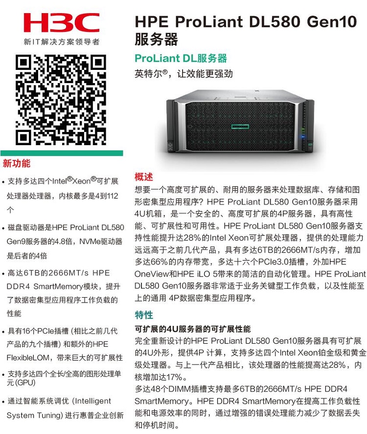 完全重新設(shè)計的HPE ProLiant DL580 Gen10服務(wù)器具有可擴(kuò)展的4U外形,提供4P 計算,支持多達(dá)四個Intel Xeon鉑金級和黃金級處理器。與上一代產(chǎn)品相比,該處理器的性能提高達(dá)28%,內(nèi)核增加達(dá)17%。多達(dá)48個DIMM插槽支持多達(dá)6TB的2666MT/s HPE DDR4SmartMemory。HPE DDR4 SmartMemory在提高工作負(fù)載性能和電源效率的同時,通過增強(qiáng)的錯誤處理能力減少了數(shù)據(jù)丟失和停機(jī)時間。
