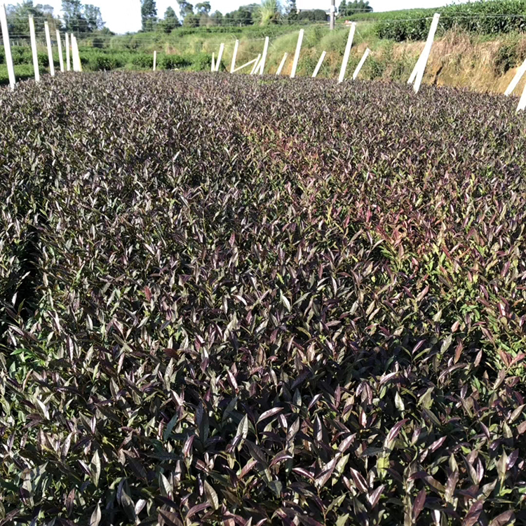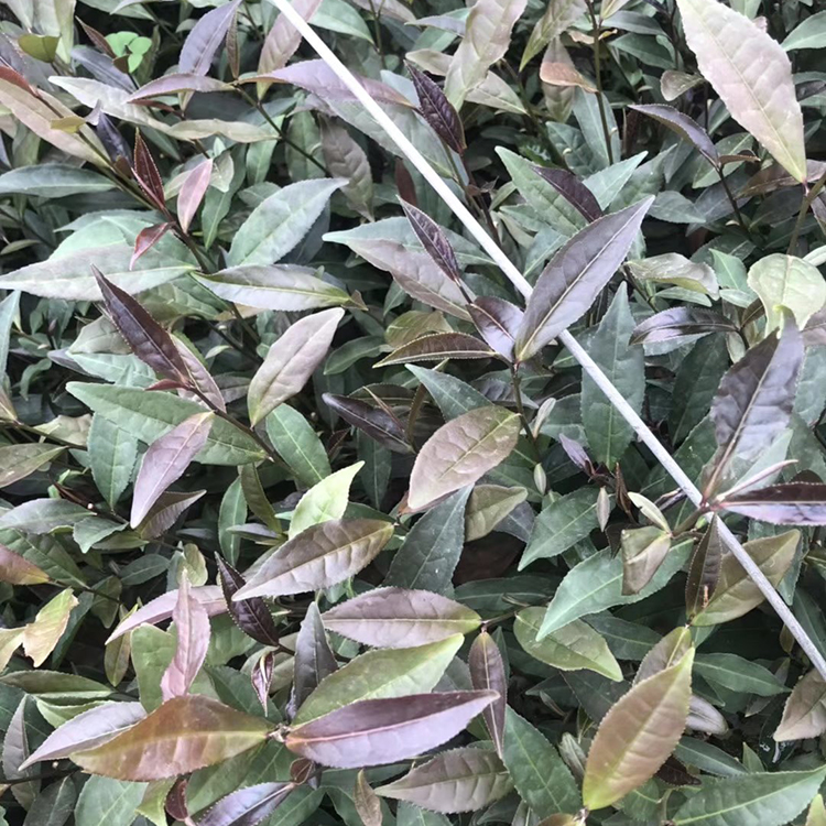 “紫娟”茶樹屬小喬木型,大葉類,中芽種。 樹姿半開展,骨干枝較粗壯,分枝部位較高,分枝密度中等,葉片呈上斜著生、柳葉形,葉尖漸尖,色紫色, 葉柄呈紫紅色。新稍育芽力強(qiáng),發(fā)芽密度中等,嫩梢的芽、葉、莖都為紫色,為珍惜園林觀賞植物。