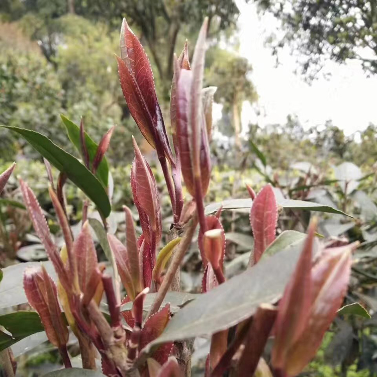 “紫娟”茶樹屬小喬木型,大葉類,中芽種。 樹姿半開展,骨干枝較粗壯,分枝部位較高,分枝密度中等,葉片呈上斜著生、柳葉形,葉尖漸尖,色紫色, 葉柄呈紫紅色。新稍育芽力強(qiáng),發(fā)芽密度中等,嫩梢的芽、葉、莖都為紫色,為珍惜園林觀賞植物。