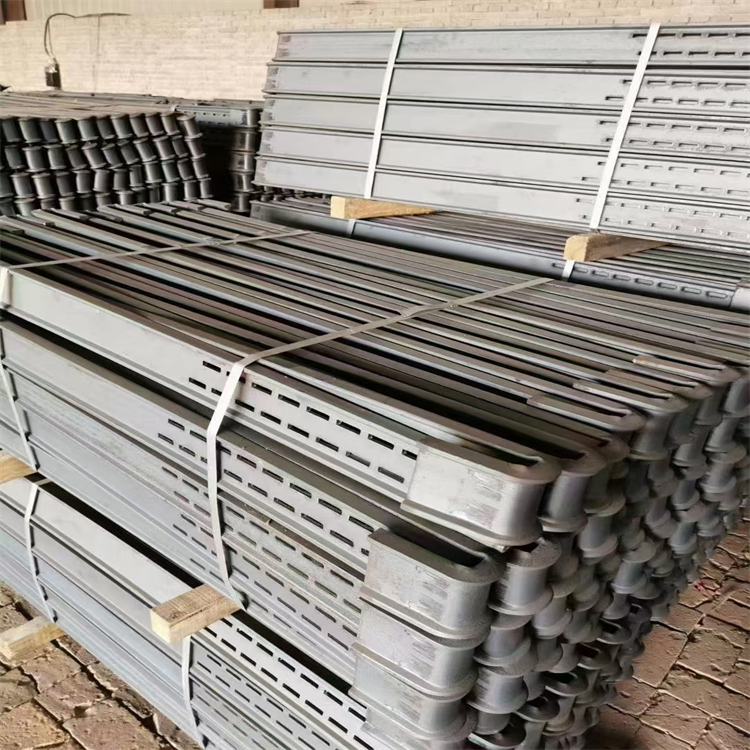 方柱扣又名方圓扣,是對應(yīng)固定方柱模板的專用定制型配套卡箍,外形有對應(yīng)四個(gè)彎頭單片鍍鋅卡板組成,卡板一端設(shè)置為折彎結(jié)構(gòu),每條卡板上沿長度方向設(shè)有若干相同間隔的固定孔,楔形固定銷穿過通孔和固定孔將限位套和卡板固定,形成安裝拆卸方便的方柱模板緊固件。眾所周知,目前我們建筑施工行業(yè)中的方柱模板加固大都是用鋼管和對拉螺桿配套使用從而進(jìn)行現(xiàn)場施工。由于在傳統(tǒng)加固方法中方柱四周每道加固件為8 根鋼管4 根螺桿配套使用,其鋼管與螺桿的長度視方柱尺寸而定,如遇大尺寸方柱加固時(shí)中間還需要穿P V C 套管螺桿對拉以便進(jìn)行加固,以防漲模,影響柱子尺寸。在大型建設(shè)項(xiàng)目中,不同尺寸的方柱、導(dǎo)致不同尺寸長度的鋼管、P V C 套管的損耗、螺桿及零件的大量使用和損耗、租賃費(fèi)用的加重、觀感的影響、后期砂漿補(bǔ)套管眼的費(fèi)用及過程中各種規(guī)格材料量的繁雜規(guī)整,使得方柱加固的簡單化、精細(xì)化需求在現(xiàn)場的應(yīng)用越來越多。目前,方柱可調(diào)模板加固逐漸興起,更準(zhǔn)確的理解是方柱可調(diào)式加固配套卡箍一整套施工工藝,它是處理不同尺寸方柱模板加固既簡便又經(jīng)濟(jì)的方柱模板加固處理方法。