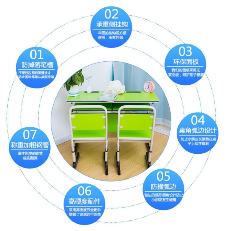 可升降鋼木學(xué)生課桌椅大容量承重強(qiáng),更大、更寬 、更厚 ,冷軋鋼一次成型課桌斗,PP注塑一體成型書包斗,科學(xué)弧形設(shè)計(jì)更美觀,涂裝材料環(huán)保無味機(jī)器人焊接手全自動(dòng)焊接、進(jìn)口拋丸機(jī)防腐、防銹、靜電噴塑制作工藝,經(jīng)久耐用,超長(zhǎng)15年質(zhì)保。細(xì)節(jié)鑄就品質(zhì)筆槽設(shè)計(jì)收納筆具防止掉筆,弧形圓角預(yù)防學(xué)生磕碰,書包掛鉤側(cè)面掛鉤便于收納,踩腳橫杠安全保護(hù)雙腳,儲(chǔ)物網(wǎng)兜收納更多,PP腳套設(shè)計(jì)防止劃傷地面,更平穩(wěn)。
