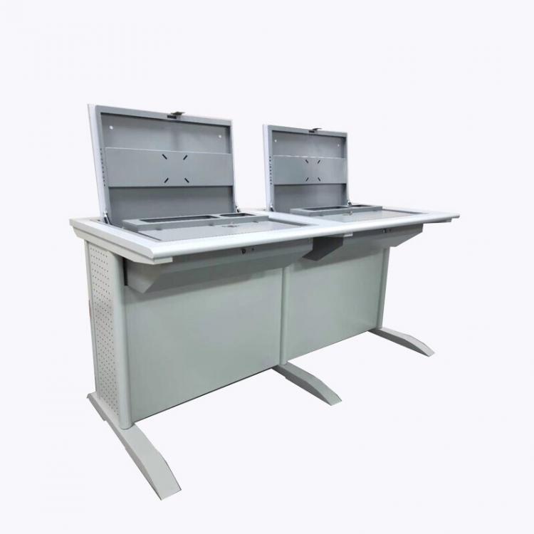 該機房電腦桌主要應(yīng)用于各種多媒體教室、多媒體會議室、多媒體電子教室、多媒體電教室、機房、培訓(xùn)中心及多功能會議廳等。當不使用時,可用手動按下翻蓋面板。整個翻轉(zhuǎn)器與桌面齊平,產(chǎn)品具有防塵保持桌面平整,美化桌面等功能。該機房電腦桌成為廣大多媒體系統(tǒng)集成公司、機房裝修、機房改造公司贏得招投標的又一技術(shù)創(chuàng)新成果。手動翻轉(zhuǎn)器主要應(yīng)用于各種高 檔會議廳,交易廳,高級多媒體網(wǎng)絡(luò)系統(tǒng),高 檔辦公場所,當開啟翻轉(zhuǎn)器時液晶顯示屏?xí)詣臃D(zhuǎn),關(guān)閉時顯示屏全部隱藏于桌內(nèi),屏面與桌面保持一致。外觀時尚,表面整潔。產(chǎn)品采用標準化的結(jié)構(gòu),設(shè)計精巧,使用方便。