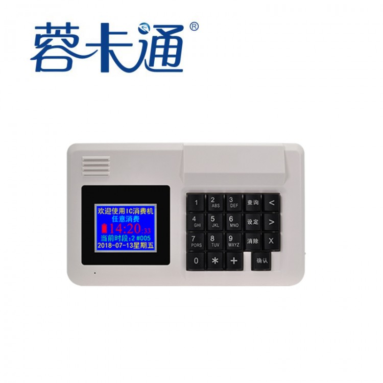 6、雙面顯示窗口:工作人員和消費者可同時查看相同的顯示內容,可顯示消費方式、剩余金額。營業(yè)收入統(tǒng)計方法簡單,直接在消費機上按“*”鍵可知道本消費機的銷售收入和消費人次。
