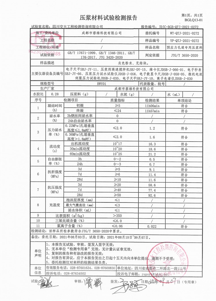 詳細信息 壓漿料一種專用于后張法預(yù)應(yīng)力管(孔)壓漿施工的產(chǎn)品由多種優(yōu)質(zhì)水泥基材料和高性能外加劑優(yōu)化配制而成,具有優(yōu)異的流動性,漿體穩(wěn)定,充盈度好,凝結(jié)時間可調(diào),無收縮、微膨脹,強度高,不含對鋼筋有害物質(zhì)等特點。