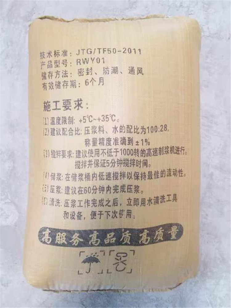 壓漿料一種專用于后張法預(yù)應(yīng)力管(孔)壓漿施工的產(chǎn)品由多種優(yōu)質(zhì)水泥基材料和高性能外加劑優(yōu)化配制而成,具有優(yōu)異的流動性,漿體穩(wěn)定,充盈度好,凝結(jié)時間可調(diào),無收縮、微膨脹,強度高,不含對鋼筋有害物質(zhì)等特點。