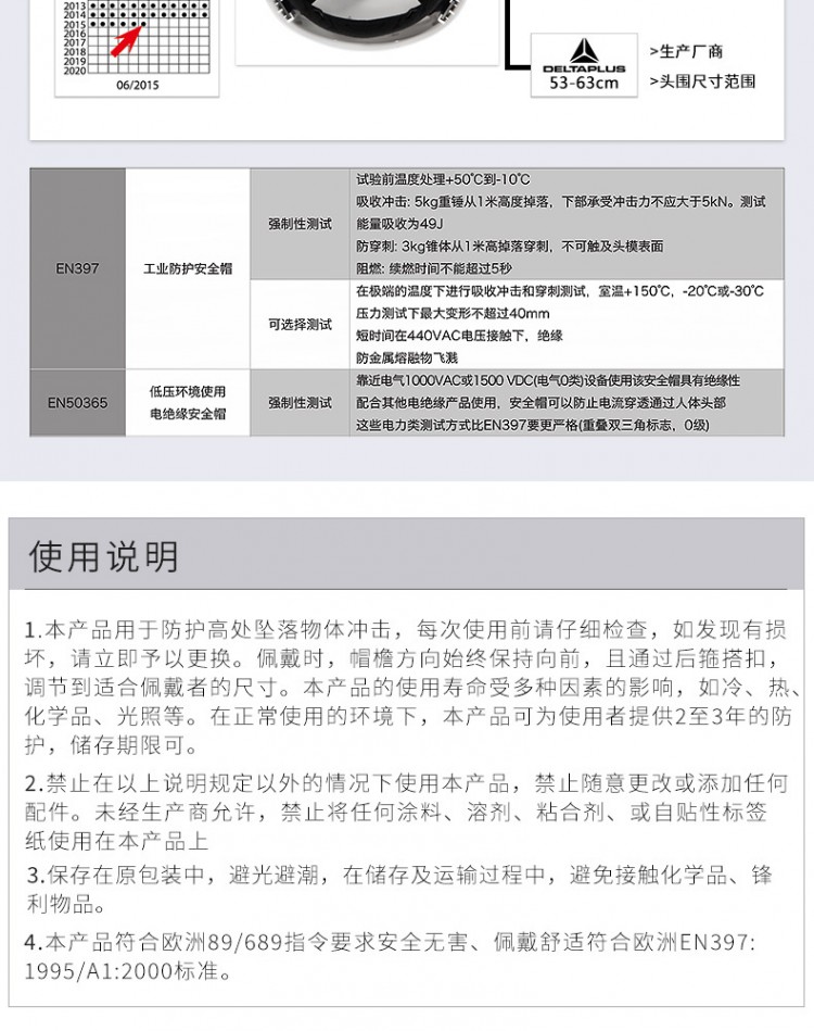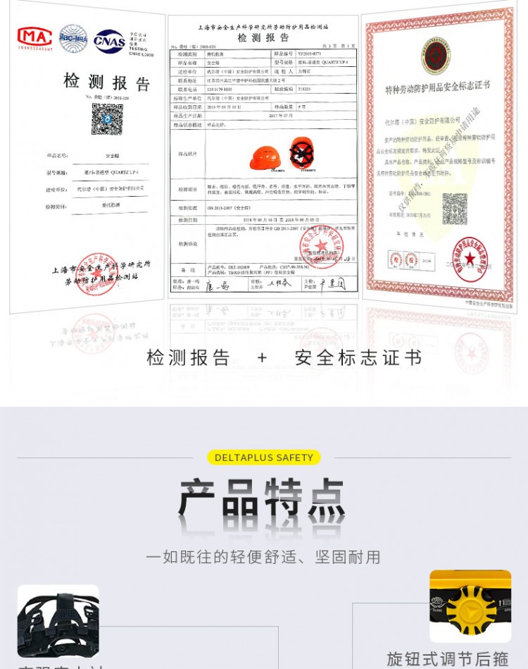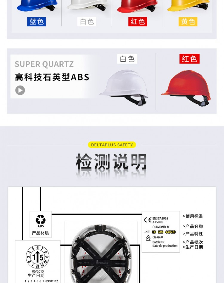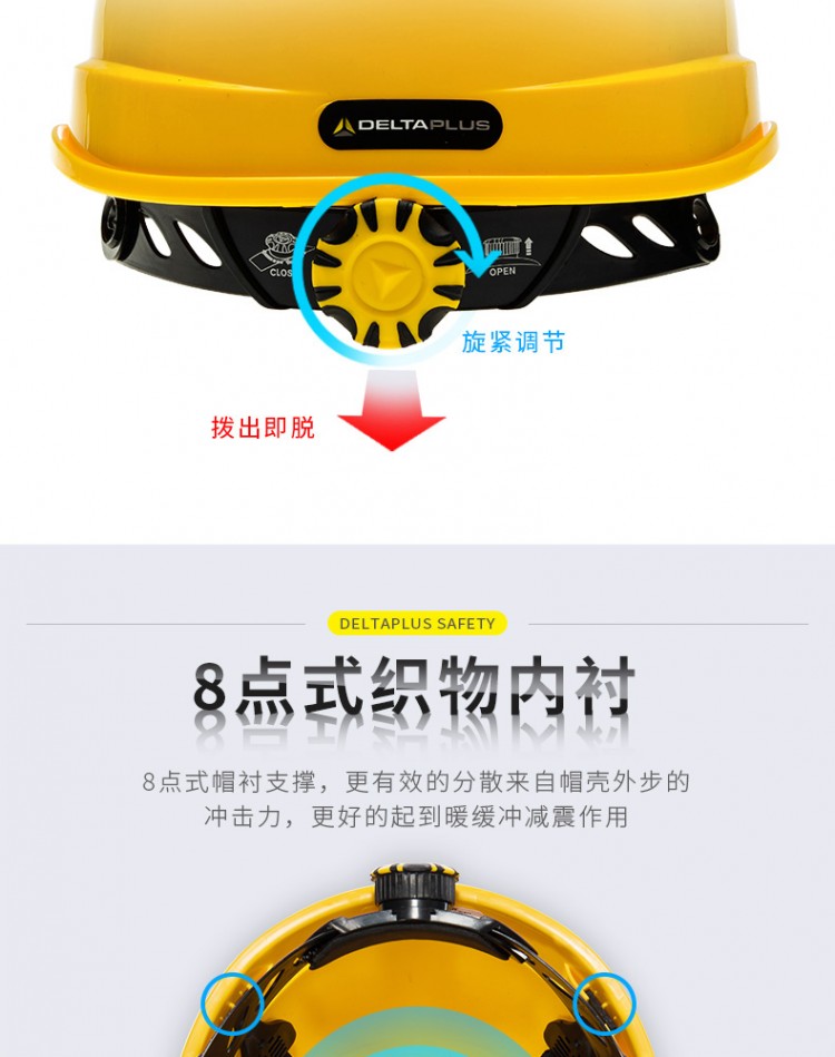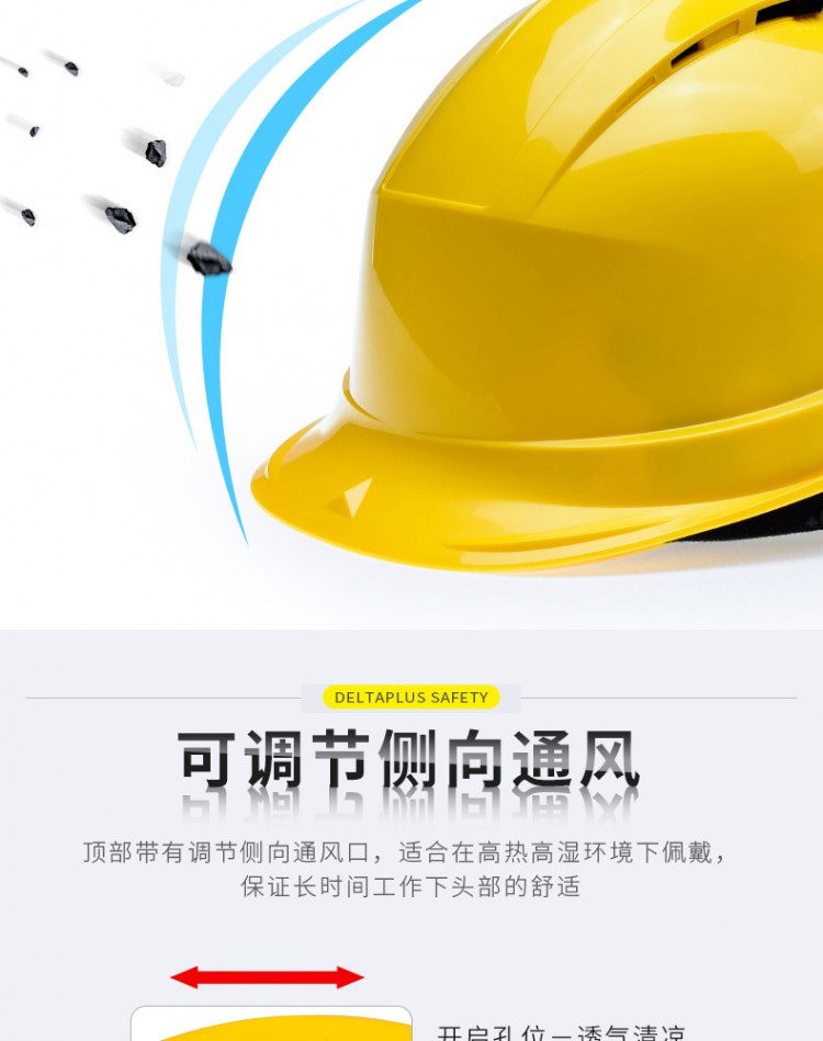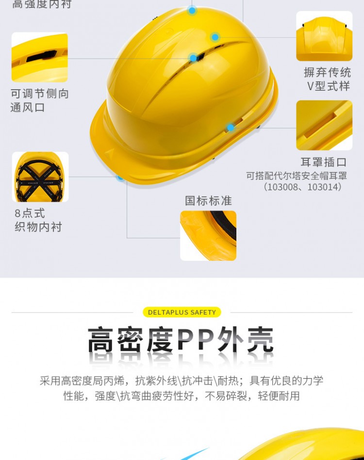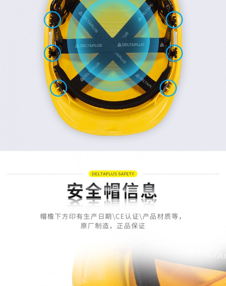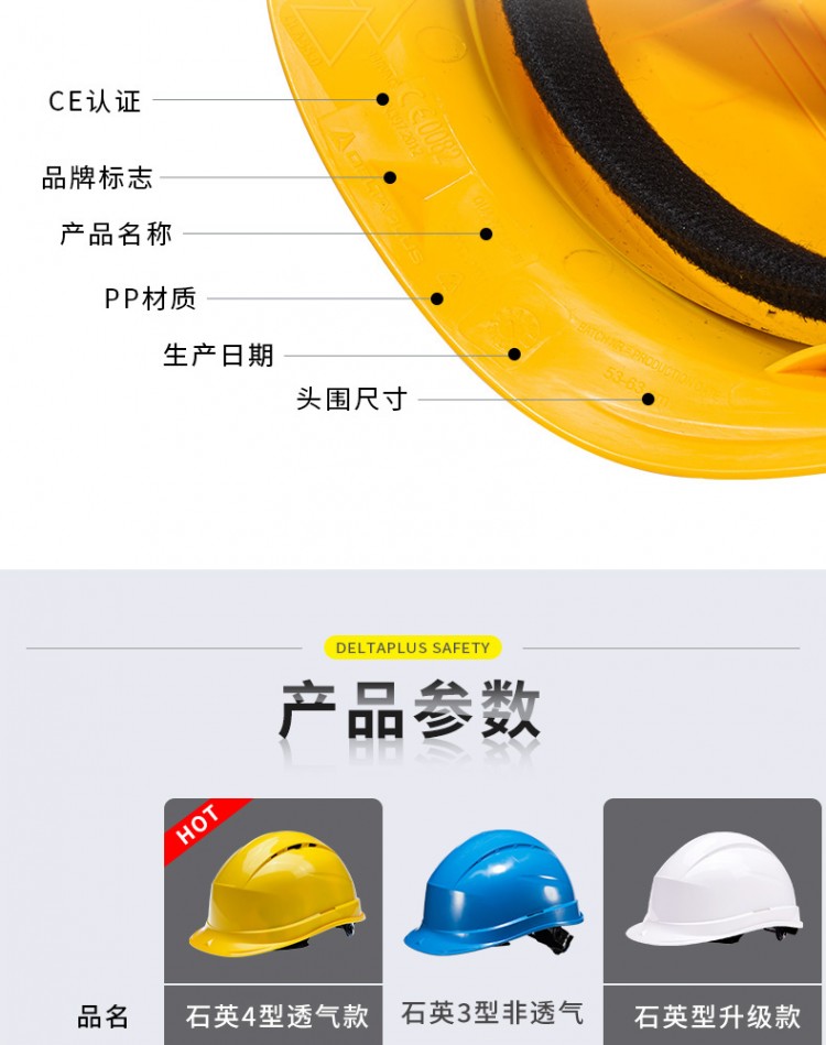 產(chǎn)品參數(shù) 產(chǎn)品名稱:deltaplus/代爾塔102009安全帽國標印字透氣建筑工程工地施工領(lǐng)導(dǎo)帽遮陽防曬頭盔8點式針織內(nèi)襯透氣安全帽