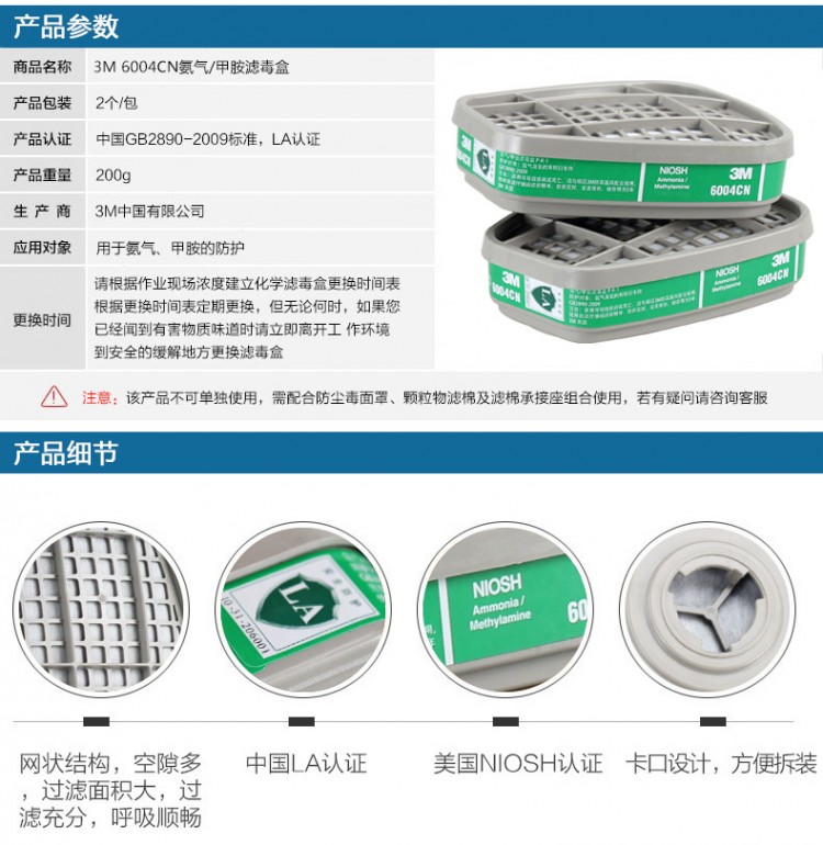 產(chǎn)品名稱:3M6004CN防毒面具活性炭化工防氨氣甲胺濾毒盒 2只裝