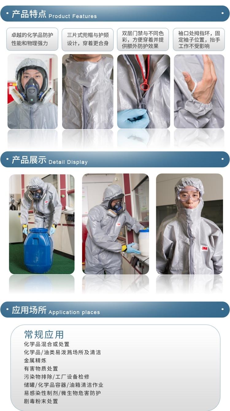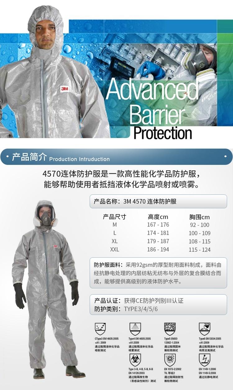 產(chǎn)品名稱:3M4570防護服防粉塵防靜電連體工作服有害化學(xué)品噴淋防化服