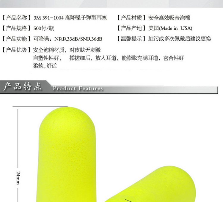 產(chǎn)品名稱:3M 391-1004高效降噪音隔音子彈型耳塞柔軟舒適型工廠耳塞