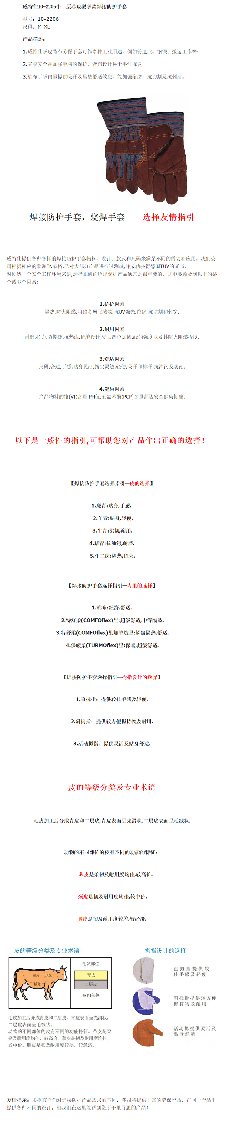 產(chǎn)品名稱:威特仕10-2206 掌皮背布勞保手套 牛二層芯皮駁掌款