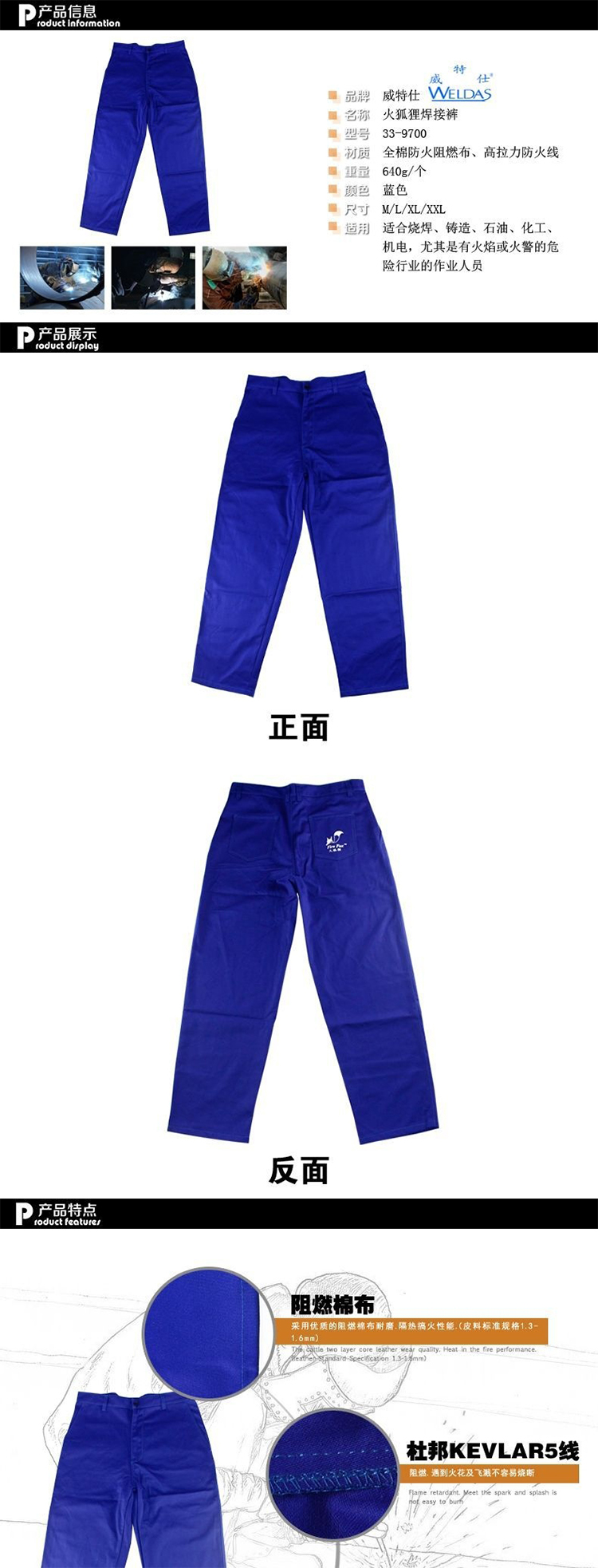 產(chǎn)品參數(shù) 產(chǎn)品名稱(chēng):威特仕33-9700 焊接褲 防火 阻燃 全棉藍(lán)色焊接褲