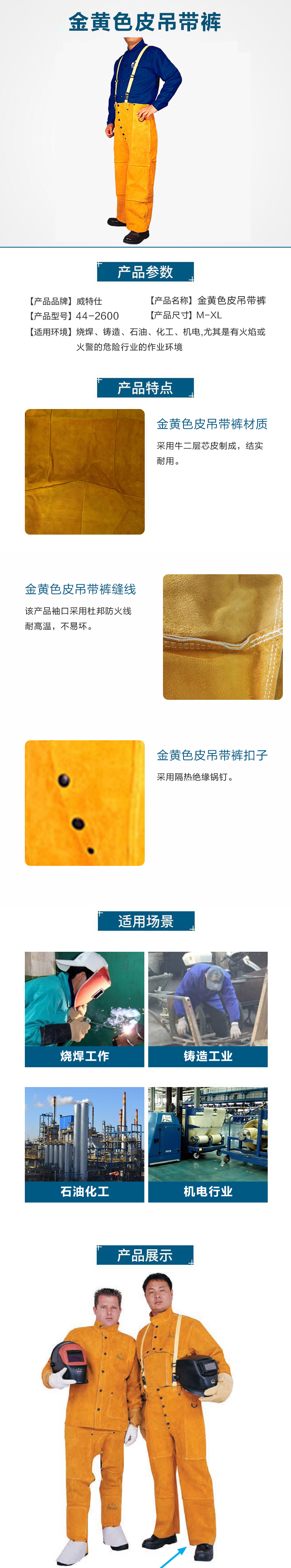 產(chǎn)品名稱:weldas/威特仕44-2600金黃皮吊帶褲牛二層芯皮耐磨、隔熱和抗火焊接褲