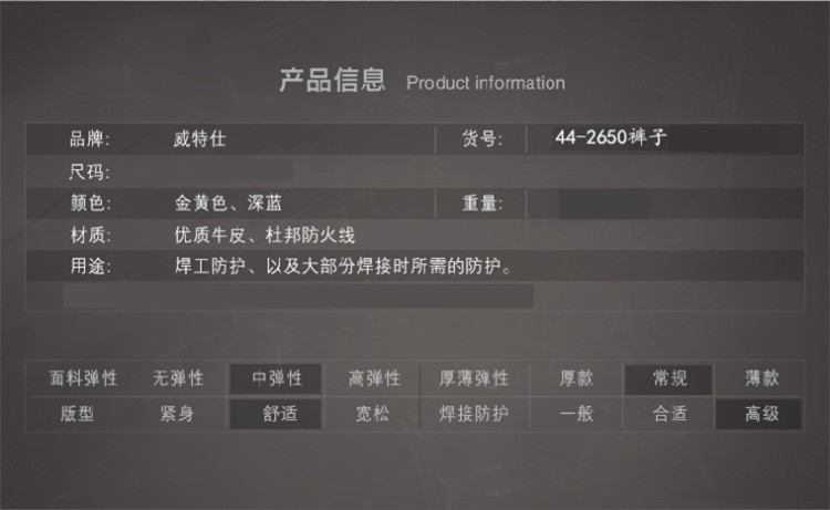 產(chǎn)品名稱:威特仕44-2650雄蜂王工作褲, 背配藍(lán)色防火阻燃布 防高溫