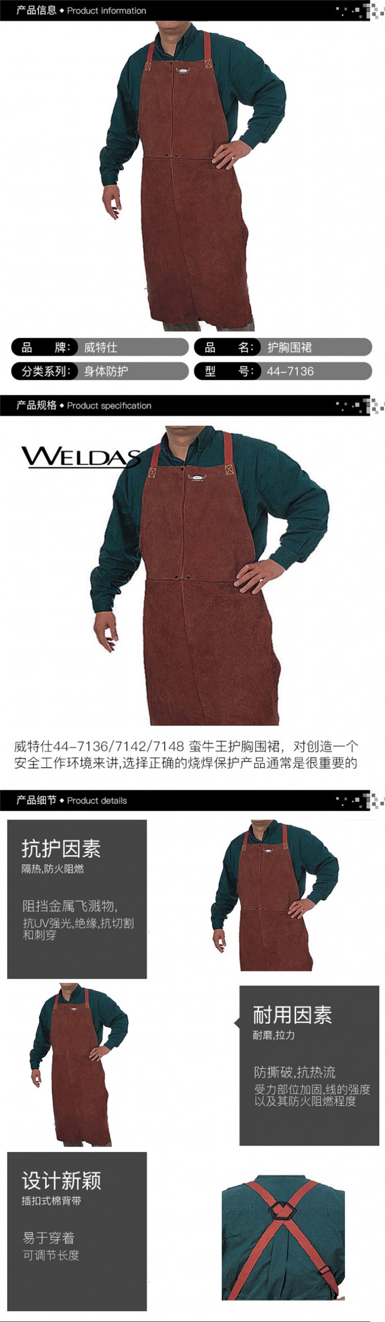 產(chǎn)品參數(shù) 產(chǎn)品名稱(chēng):威特仕44-7136焊接圍裙 蠻牛王燒焊護(hù)胸 防火阻燃電焊圍裙