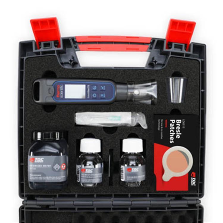 TQC表面鹽分測試——氯化鈉試驗箱符合ISO 8502-6和ISO 8502-9標準,這些標準描述了Bresle,以使用Bresle貼片或Bresle取樣器、蒸餾水和電導儀評估可溶性鹽水平。電導率主要與溶液中溶解氯離子的濃度成正比。該試驗箱包括所有必要的設備,以執(zhí)行Bresle試驗,該試驗將表明噴涂前噴砂清洗表面上的可溶性鹽的污染。在Bresle試驗箱——氯化鈉試驗箱中的是一個電導儀,用于評估氯化物、硫酸鹽和硝酸鹽等可溶性鹽離子。