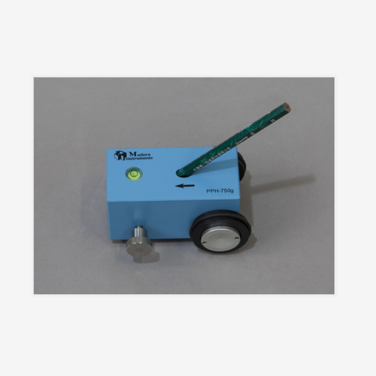 采用三點(diǎn)接觸被測(cè)表面(兩點(diǎn)為滾輪,一點(diǎn)為鉛筆芯),鉛筆與被測(cè)表面夾角為45°,水平泡水平時(shí)主體加在鉛筆芯上的壓力有三種規(guī)格:500±10克、750±10克、1000±10克(如圖)。通過(guò)在漆膜上劃過(guò)已知硬度標(biāo)號(hào)的鉛筆來(lái)測(cè)定漆膜硬度。