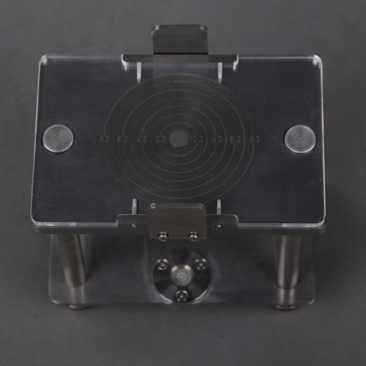 將一定量的油墨(0.5厘米3)放在水平放置的二平行板之間,使具有一定質(zhì)量的上平板(115克,由透明材料制成)水平地在固定高度上自由下落并壓在油墨上,油墨向外鋪展,測定鋪展直徑與時間的關(guān)系,直到油墨不再鋪展的大直徑為止。以時間t的對數(shù)lgt為橫坐標,鋪展直徑d為縱坐標作圖,即可得到在一定程度上表示油墨流動特性的特征曲線。下板表面刻有許多直徑不同的圓圈,可以觀察并記錄油墨鋪展情況。通常讀取10秒,60秒和100秒時油墨邊緣所處的位置——圈數(shù),及油墨不再鋪展時的大直徑。