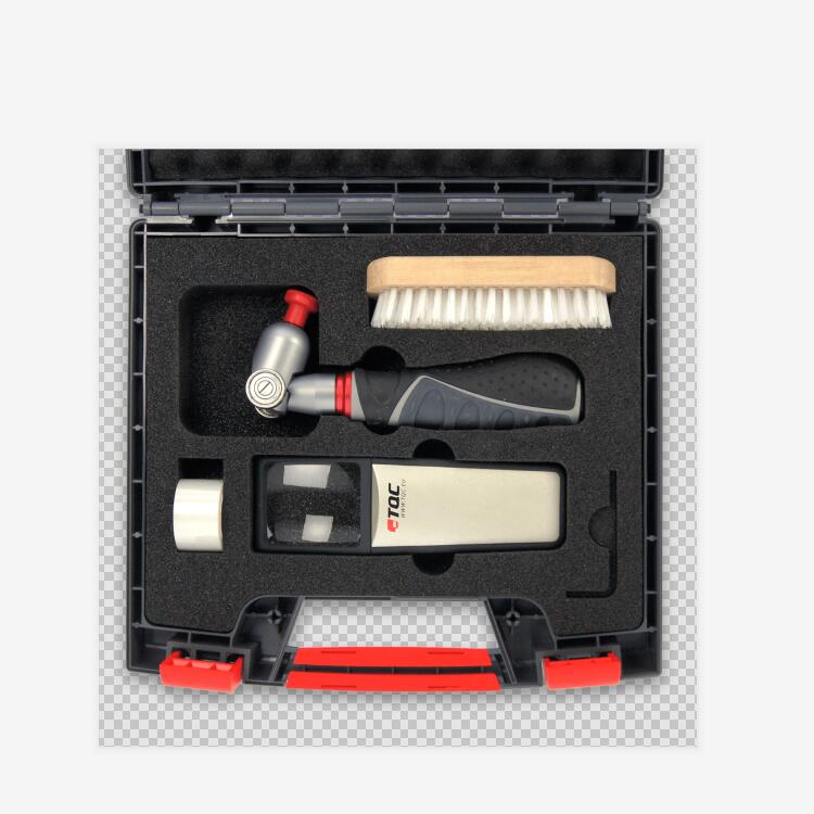 TQC 劃格器通過(guò)一系列貫穿涂層的切口來(lái)測(cè)試干漆在其基材上的附著力。劃出兩系列平行線,彼此互相垂直,從而獲得25個(gè)或100個(gè)形狀大小相似的方格。用硬毛刷子擦刷劃格區(qū)域或者粘上膠帶再撕下來(lái),觀察被處理后的涂層脫落情況,根據(jù)受損面積標(biāo)準(zhǔn)進(jìn)行評(píng)判附著力等級(jí)。