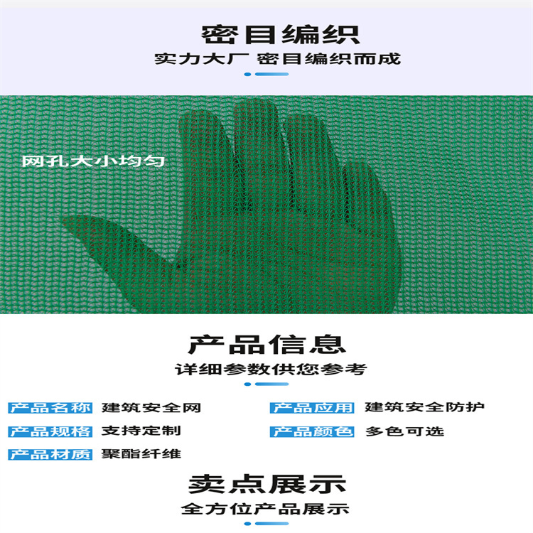 詳細(xì)信息  密目式安全網(wǎng)采用阻燃聚乙烯合成材料編織而成,網(wǎng)面四周襯有安全繩以增加密目安全網(wǎng)的抗沖擊性,安全繩內(nèi)側(cè)有帶孔的金屬扣用于將密目安全網(wǎng)固定在建筑腳手架之上。