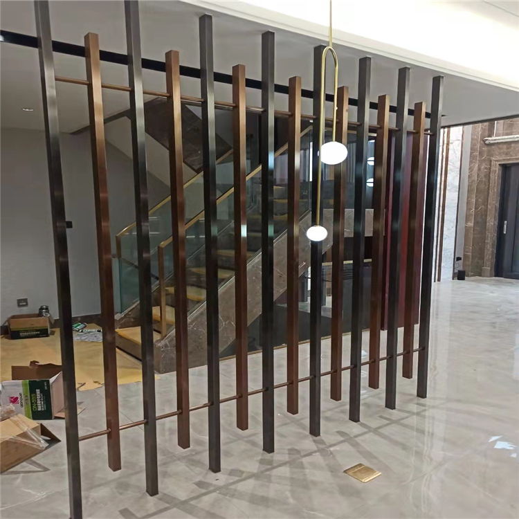詳細信息 不銹鋼屏風,是采用不銹鋼材質(zhì)的管材或者板材,經(jīng)過切割、焊接、打磨、拋光等一系列工序處理,鍍上顏色,制作成的金屬屏風。