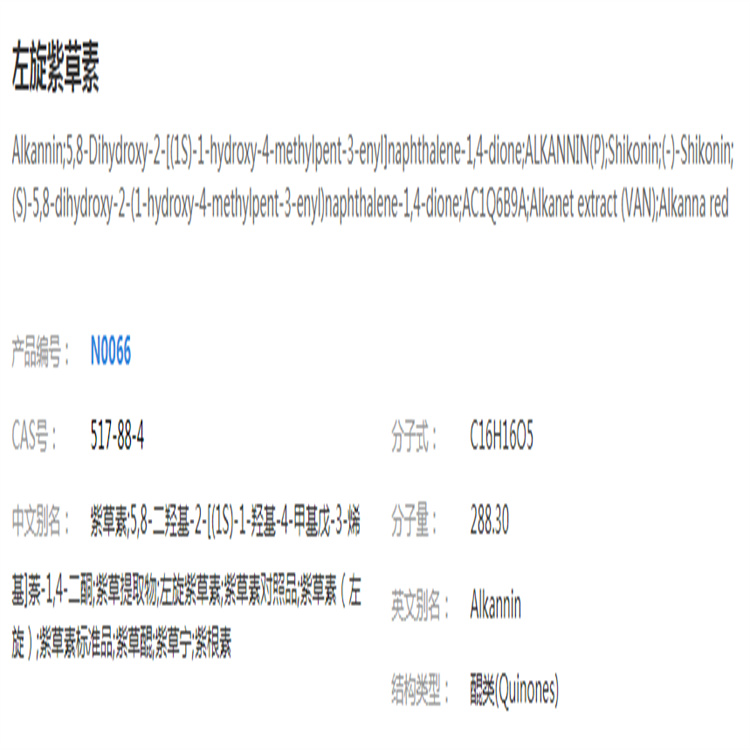 左旋紫草素 自制對照品 中檢院 純度高 科研專用