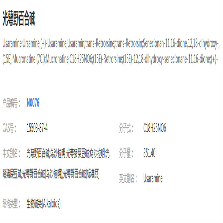 光萼野百合堿 對照品標(biāo)準(zhǔn)品 純度高 圖譜全 直供科研