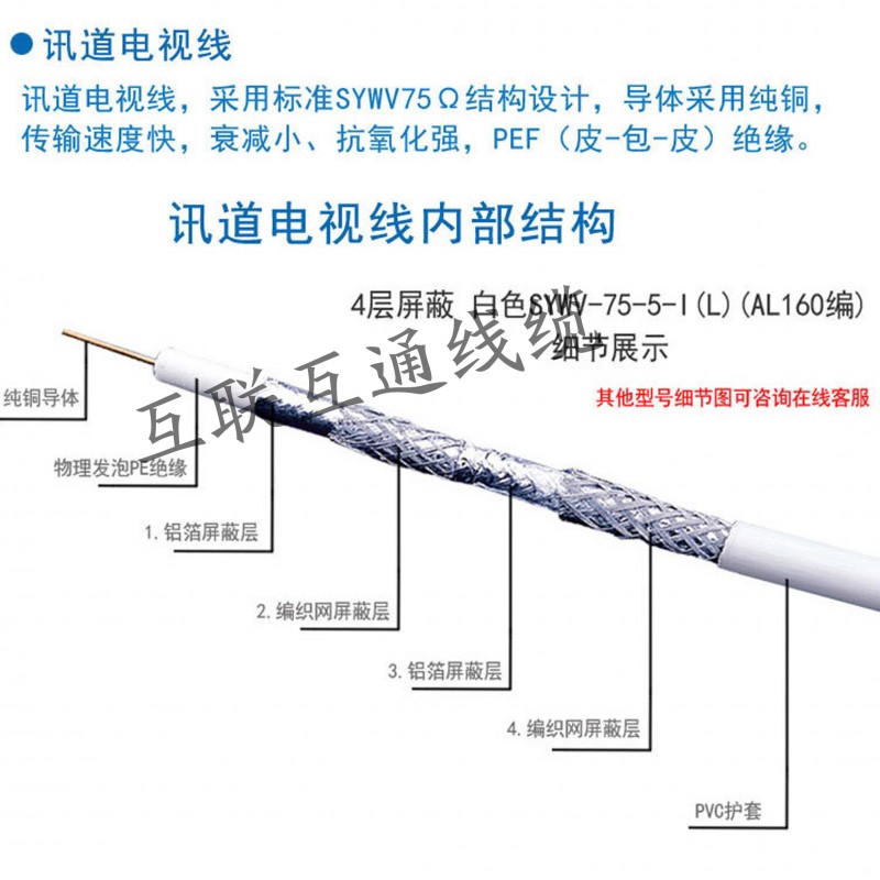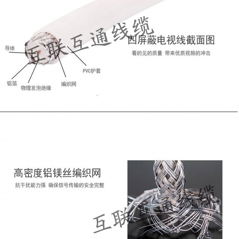 內(nèi)導(dǎo)體使用單支裸圓銅線,物理發(fā)泡聚乙烯絕緣,外包鋁箔屏蔽,鍍錫軟銅線紡織屏蔽,聚氯乙烯護(hù)套