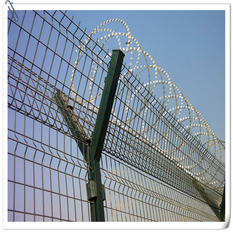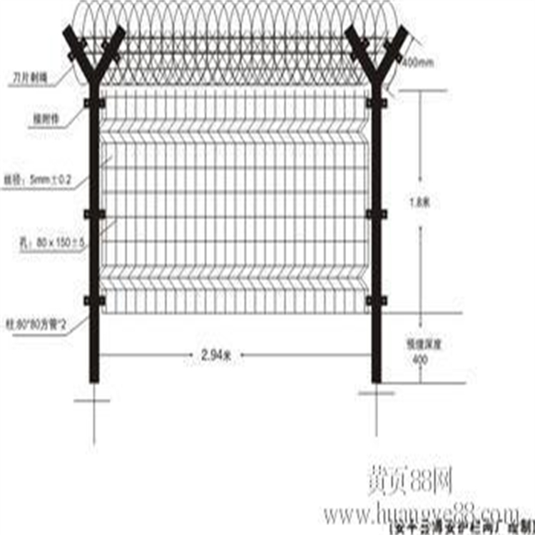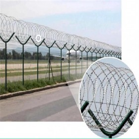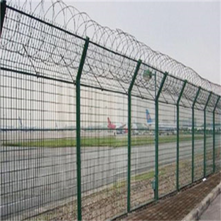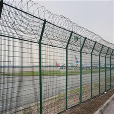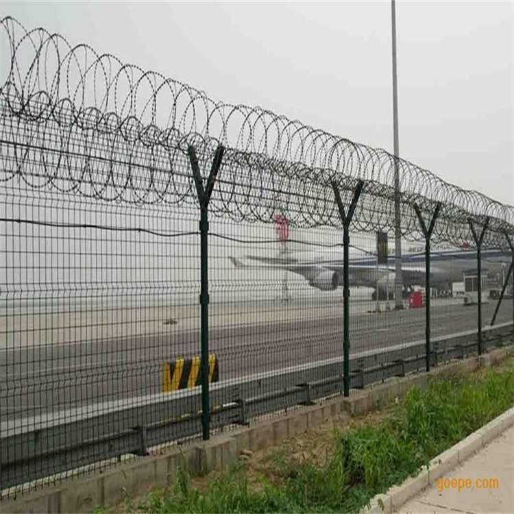機(jī)場(chǎng)浸塑安全護(hù)欄又稱作機(jī)場(chǎng)隔離柵、Y型安全防御護(hù)網(wǎng),是由V型支架立柱,型焊接片網(wǎng),安全防盜連接件和熱鍍鋅刀片刺網(wǎng)組成強(qiáng)度和安全防御性級(jí)別很高。近年來,被應(yīng)用在機(jī)場(chǎng),軍事基地等高安全場(chǎng)所。