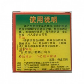本品是由食料、引誘劑組成,是殺滅蟑螂、螞蟻的。具有誘餌強(qiáng),殺滅徹底,對人畜安全無害的特點(diǎn)。