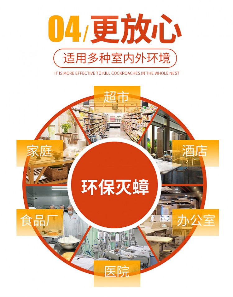 將藥餌放在蟑螂、螞蟻活動的地方,多點(diǎn)投放,24小時(shí)后相互傳染、相互殘殺,就會感染同巢全部死亡。