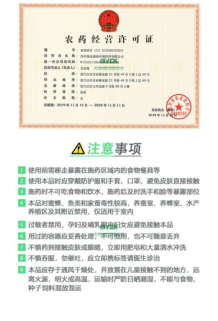 四川康益誠康環(huán)境管理有限公司是2018年成立的高新技術企業(yè),至今公司已累積近20年的有害生物防治消殺經驗,并且在這期間審核通過了國家質量管理體系ISO9001:并且獲得了國家有害生物防治A級資質證書、企業(yè)信用A級等級證書、有害生物防治服務機構服務能力A級證書、等多個資質證書,公司除了在成都的總部以外,分別全國各地都設有多個辦事處。先后為皇冠假日酒店、萬科物業(yè)、華潤物業(yè)、仲量聯行、誼品生鮮、青白江人民醫(yī)院等等數百家單位提供有害生物消殺服務。公司擁有2名長期從事PMP工作的教授專家和有害生物防制高級職稱5名,中級職稱8名,處級職稱、醫(yī)學、工程博士、碩士等數十名。公司引進國內外先進的消殺器械設備,所有藥劑環(huán)保且符合國際標準,對人體健康無害。