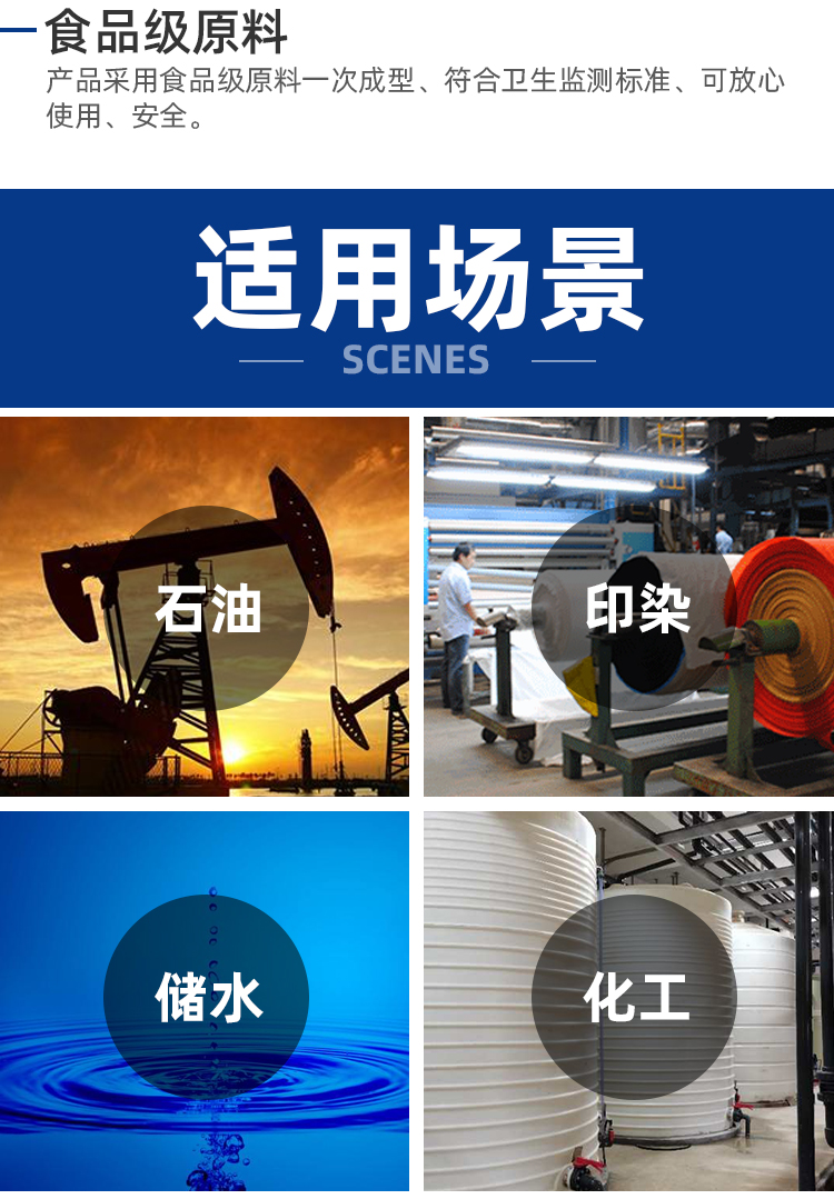 詳細(xì)信息 儲(chǔ)罐水塔又名PE水箱、塑料水箱、塑料水塔、聚乙烯儲(chǔ)罐等,采用進(jìn)口食品級(jí)線性低密度聚乙烯(LLDEP)滾塑一次成型而成。PE水箱容器內(nèi)外光滑,具有耐酸堿、耐碰撞、耐高溫(80℃)、耐冷凍(-30℃)以及抗紫外線防老化性能。水箱安裝運(yùn)輸安全便捷、無需維修、移動(dòng)方便。PE水箱、塑料水箱、塑料水塔、聚乙烯儲(chǔ)罐廣泛應(yīng)用于石油化工、電子電鍍、紡織印染、水處理、釀造食品、水產(chǎn)養(yǎng)殖、冷凍冷藏、家庭液體儲(chǔ)存、運(yùn)輸、調(diào)和容器,是替代板材焊接、玻璃鋼、不銹鋼和陶土罐的理想容器。每只水箱可開進(jìn)水、出水、排污、濫流口,水箱應(yīng)放置在受力狀況良好的平臺(tái)上。我們建議每只水箱應(yīng)加裝補(bǔ)強(qiáng)套,有特殊要求請(qǐng)咨詢。