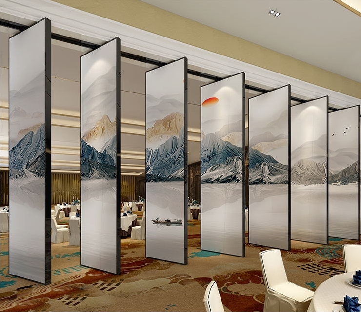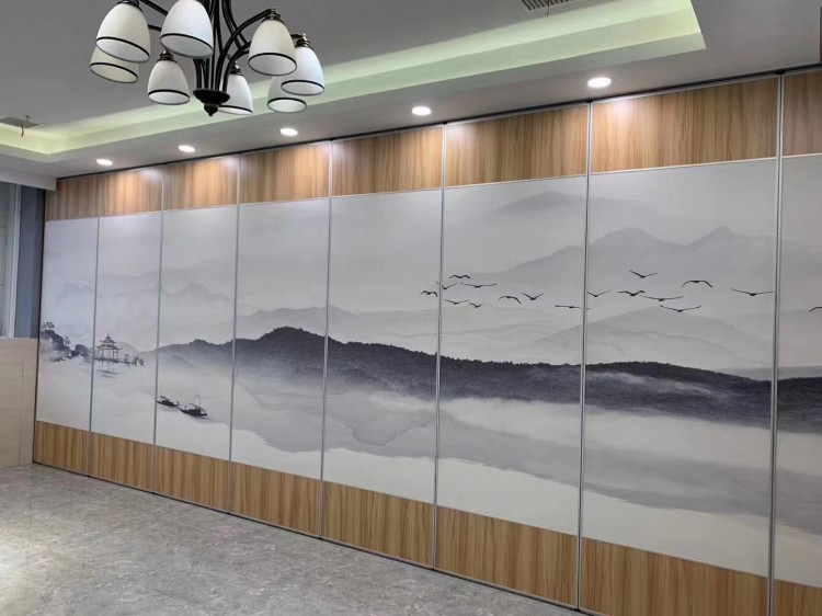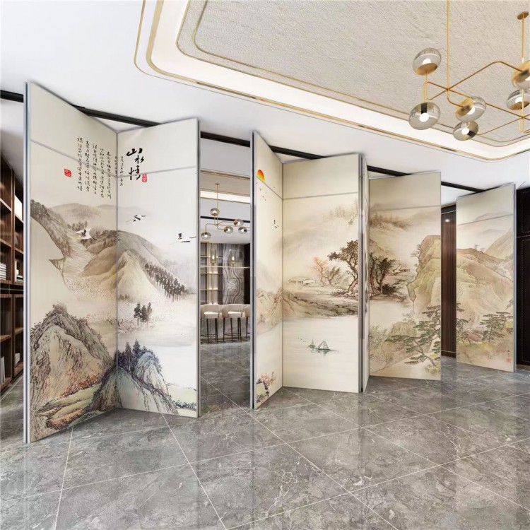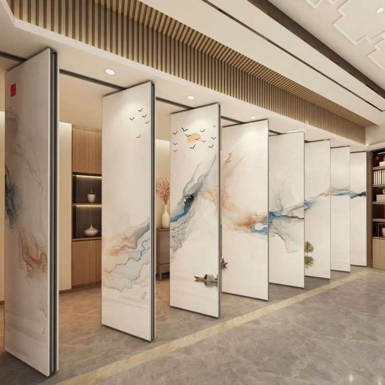 飯店包間山水畫定制移門活動隔斷 無地軌吊掛隔音門屏風