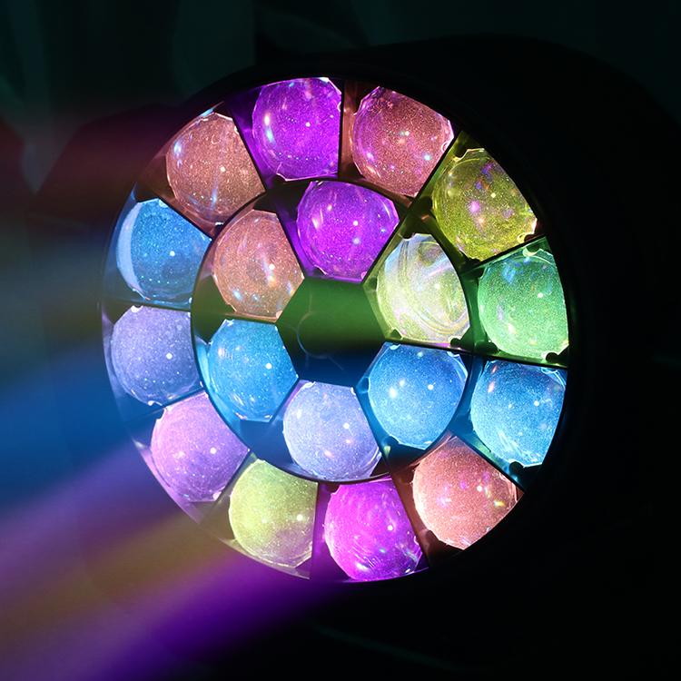 十九顆旋轉調焦大蜂眼是一款創(chuàng)新?lián)u頭燈具,具有光束,染色,眾蜂飛舞的光束三合一功能,以高品質OSRAM REBG四合一LED燈珠為光源,單顆可控,4~60°超大范圍變焦,可從Beam到Wash隨意轉換,獨特的可旋轉的二次透鏡光盤,可創(chuàng)造出美輪美幻的動感效果。
