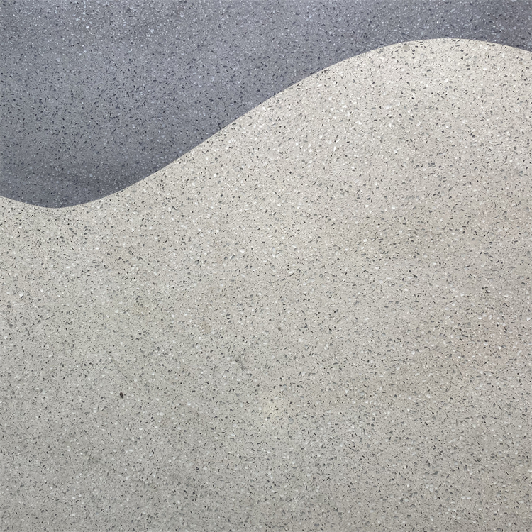 6、按照設(shè)計(jì)厚度攤鋪水泥基磨石材料一道。用水泥基磨石漿料按規(guī)定比例,加水?dāng)嚢杈鶆蚝螅幢壤尤脒x型好的規(guī)格及顏色骨料,再次攪拌均勻后,攤鋪在施工好的界面劑上找平后壓實(shí)抹平,等待初凝。注意如果有分色,按定位好的隔條分色攤鋪,如果有圖案,需預(yù)先用KT板或其它材質(zhì)聚乙烯板刻制好圖案模具,定位固定好。磨石料攤鋪時(shí)按圖案顏色分次攤鋪;