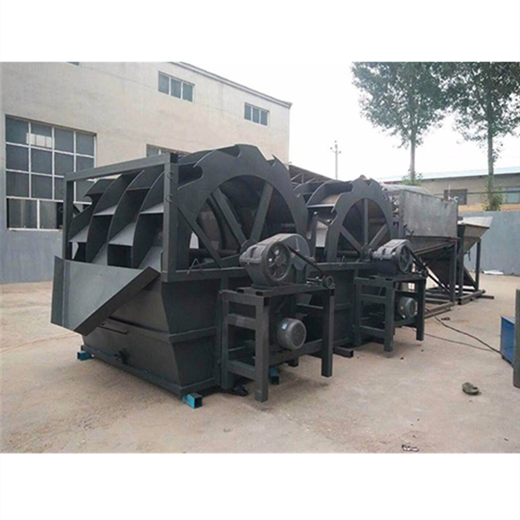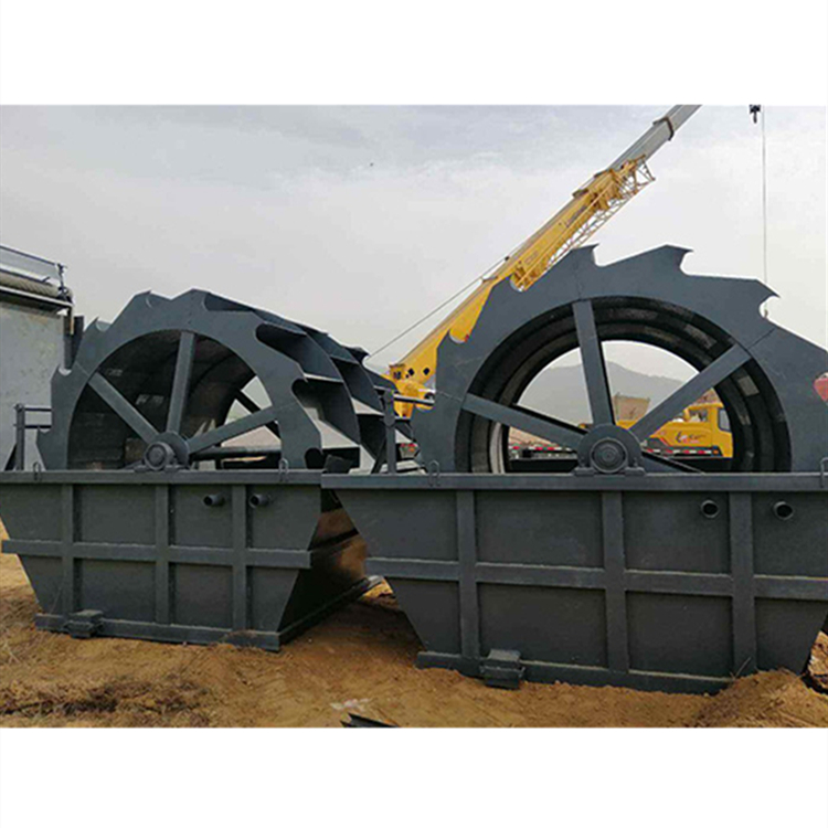 輪斗洗砂機(jī)工作時經(jīng)電動機(jī)、減速機(jī)的傳動,驅(qū)動水槽中的葉輪不停的在水槽中作圓周性轉(zhuǎn)動,從而將水槽中的砂石或礦渣顆粒物料在水中攪拌、翻轉(zhuǎn)、淘洗并使受水物料在葉輪中脫水后排出。排出管可以根據(jù)客戶現(xiàn)場的實際情況左右開口。