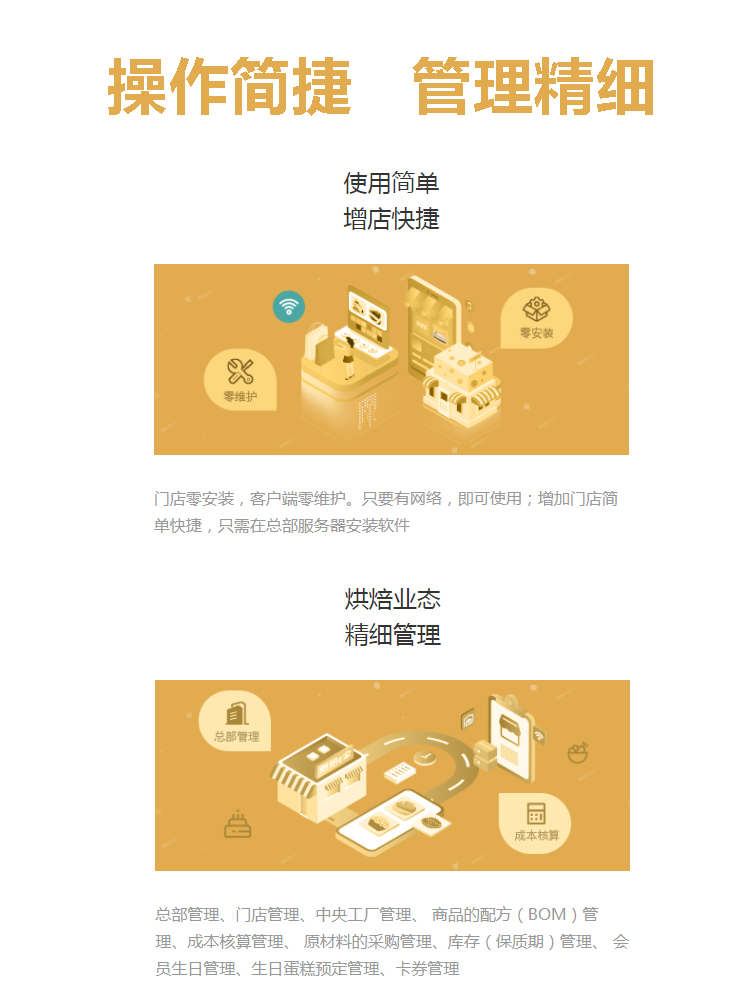 總部管理、門(mén)店管理、中央工廠管理、 商品的配方(BOM)管理、成本核算管理、 原材料的采購(gòu)管理、庫(kù)存(保質(zhì)期)管理、 會(huì)員生日管理、生日蛋糕預(yù)定管理、卡券管理