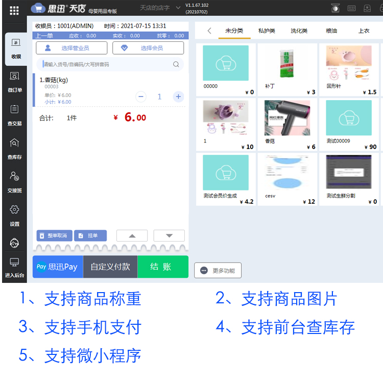 9、前臺(tái)收銀:支持各類收銀機(jī),支持多種收銀方式如支付寶、微信、云閃付、現(xiàn)金、會(huì)員卡等