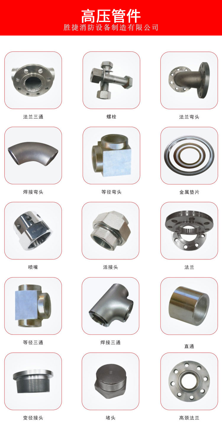 詳細(xì)信息 高壓管件有各種口徑的彎頭、等徑三通、直通、活接、補(bǔ)芯、堵頭、法蘭等高中壓氣體滅火管道連接專用管件。材料全部使用20#鋼鍛件,內(nèi)外表面鍍鋅處理,性能參數(shù)符合國家標(biāo)準(zhǔn),使用安全可靠。安全滿足七氟丙烷、二氧化碳、IG541混合氣體滅火系統(tǒng)管網(wǎng)安裝的要求。