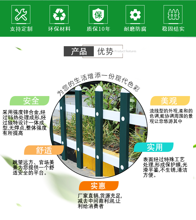 4、安全、環(huán)保,對(duì)人(畜)無(wú)害,即使無(wú)意觸及護(hù)欄也不會(huì)像鋼,鐵護(hù)欄那樣傷人。