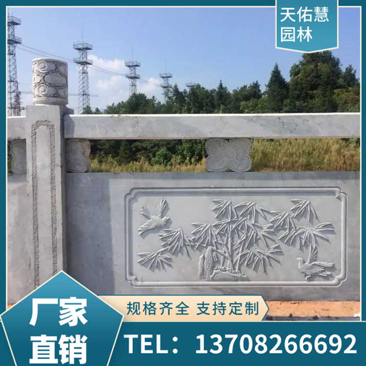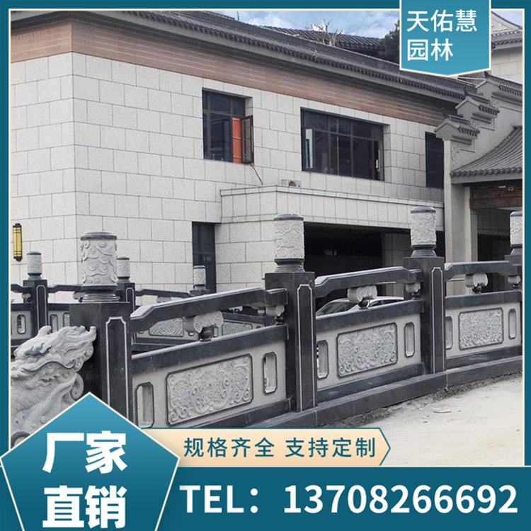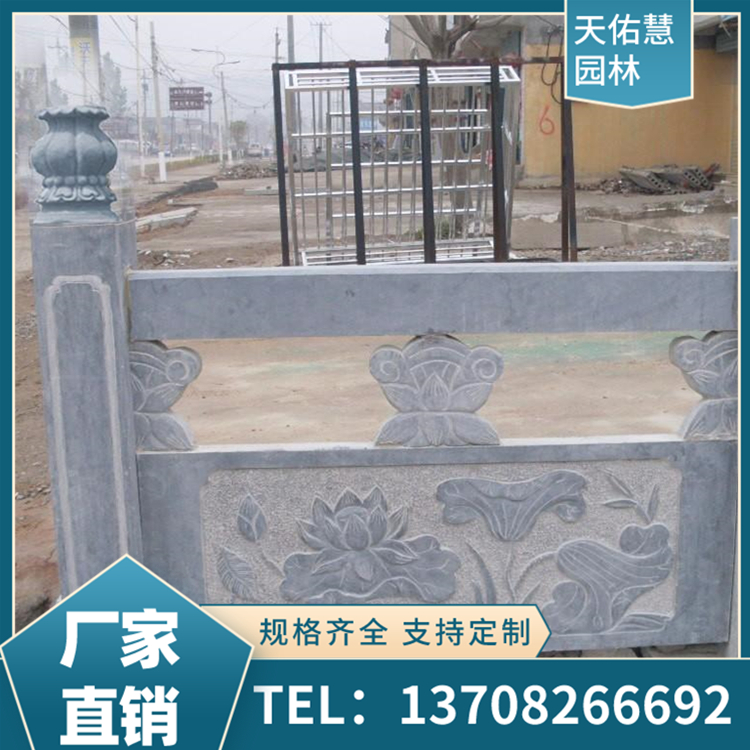 青石欄桿是由外形美觀的立柱和鑲嵌圖案按一定間隔(距離)排成柵欄狀的構(gòu)筑物。在園林環(huán)境中起到安全防護(hù)、隔離和裝飾美化、隔窨的作用。其圖案也有裝飾意義,因此處理好隔離和美化的關(guān)系,是欄桿設(shè)計(jì)成功的關(guān)鍵。