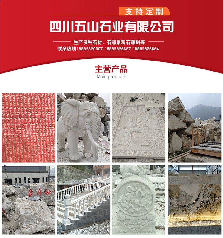 漢白玉是一種晶瑩潔白的大理石,色白純潔,內(nèi)含閃光晶體,給人一塵不染和莊嚴(yán)肅穆的美感。漢白玉的產(chǎn)量占整個(gè)大理石產(chǎn)量的30%左右,多作為雕塑人像、佛像、欄桿、浮雕、板材裝飾等。從中國(guó)古代起,用漢白玉石料制作宮殿中的石階和護(hù)欄,所謂“玉砌朱欄”,華麗如玉,所以稱做漢白玉。天安門(mén)前的華表,金水橋,宮內(nèi)的宮殿基座,石階,護(hù)欄都是用漢白玉制作的。漢白玉是中國(guó)古代 建筑、雕刻使用的名貴石料,故宮、天壇、天安門(mén)金水橋等經(jīng)典建筑都有大量使用。在人民英雄紀(jì)念碑、 、紀(jì)念堂等當(dāng)代 工程中,也有廣泛應(yīng)用。現(xiàn)在,將晶瑩潔白的漢白玉同精細(xì)的雕工結(jié)合,生產(chǎn)了許多色調(diào)淡雅,紋理清晰,圖案美觀的工藝品,漢白玉石雕塑也是公司的主打產(chǎn)品之一,您只需提供基本的資料,設(shè)計(jì)制作施工都由我們包辦,您滿意為止。