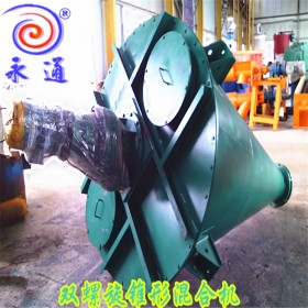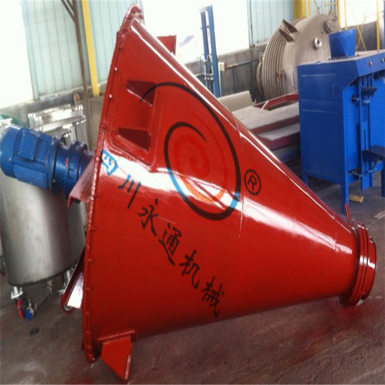 錐形混合機由兩根非對稱螺旋的快速自轉(zhuǎn),物料向上提升,形成兩股非對稱沿筒壁由下向上的螺旋物料流達到混合效果。