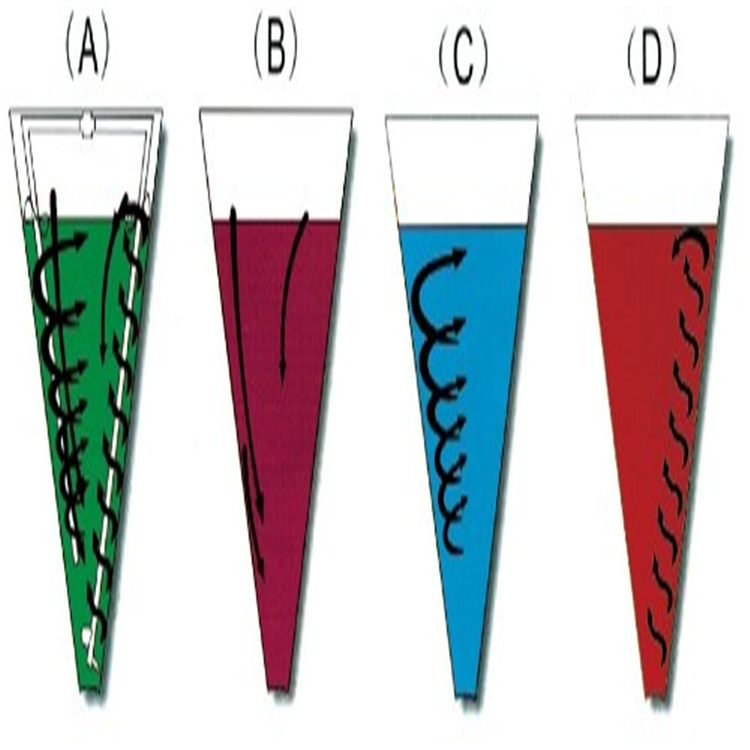 混合機由兩根非對稱螺旋的快速自轉(zhuǎn),物料向上提升,形成兩股非對稱沿筒壁由下向上的螺旋物料流(見圖A、B)。轉(zhuǎn)臂帶動的螺旋公轉(zhuǎn)運動,使螺旋外的物料不同程度進入螺柱包絡(luò)線內(nèi),一部分物料被錯位提升,另一部分物料被拋出螺柱,從而達到全圓周方位物料的不斷更新擴散,被提到上部的兩股物料再向中心凹穴匯合,形成一股向下的物料流,補充了底部的空穴,從而形成對流循環(huán)。(見圖C、D)由于上述運動的反復(fù),物料在較短的時間內(nèi)獲得了均勻混合,混合程度較高。
