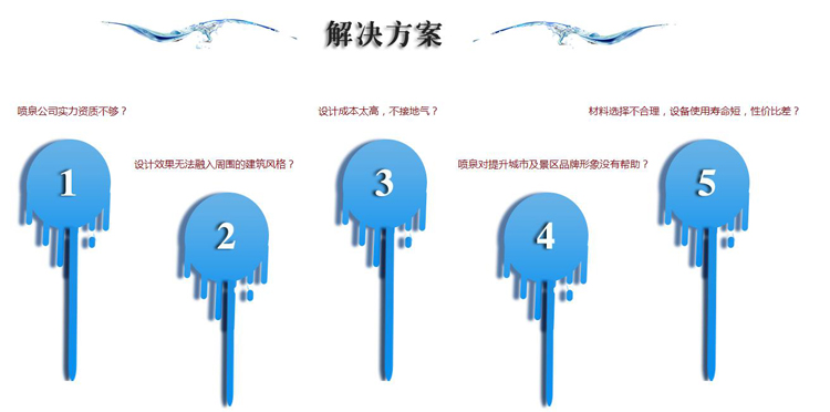 此外,還有高噴泉、旱噴泉、疊泉、音樂噴泉、跑泉、跳泉、浮動噴泉、小品泉、意動泉、音樂跑泉等,還可以通過噴霧形成獨(dú)特的水景。