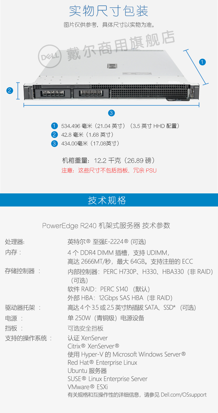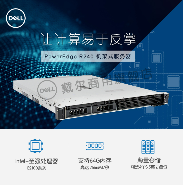 戴爾(DELL) R240機(jī)架式服務(wù)器(至強(qiáng)E-2224四核3.4GHz 16G ECC 2TBSATA 2盤位 3年專業(yè)支持)丨成都戴爾服務(wù)器總代理