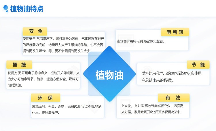 生活燃料燃油,綠色清潔,節(jié)能省錢,看得見。用它炒菜不黑鍋底,沒油煙,無異味,火力猛。成本只有煤氣的三分之一左右,用塑料桶即可存放,燃料為淡黃色,比柴油.液化氣更安全。用它炒菜,火力更大,出菜速度更快,操作更便捷。